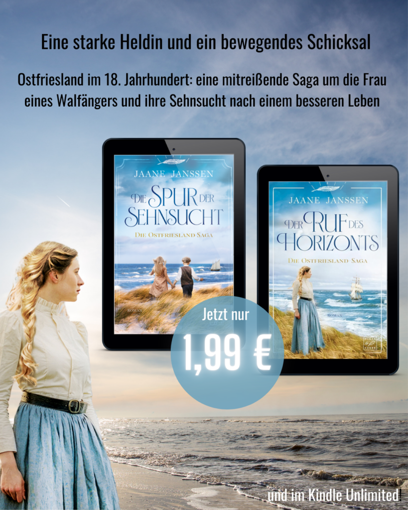 Jaane Janssen ist mein neues Pseudonym. Wenn du gern Geschichten liest, die mit Abenteuer, Spannung, Romantik und Dramatik aufwarten, in einem historischen Setting, dann wird dir meine neue OSTFRIESLAND SAGA gefallen! Beide Bände sind im Februar in Aktion als Ebook!